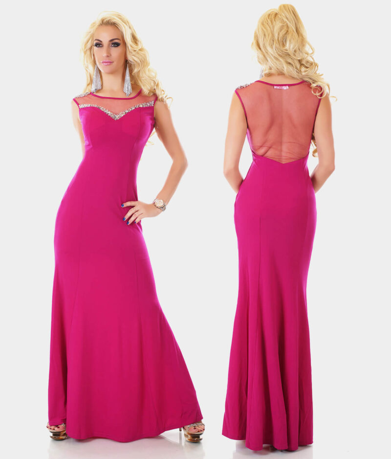 Ženska dolga obleka v roza barvi.