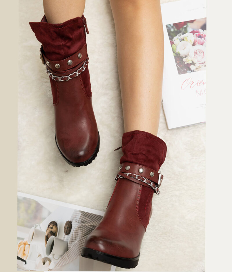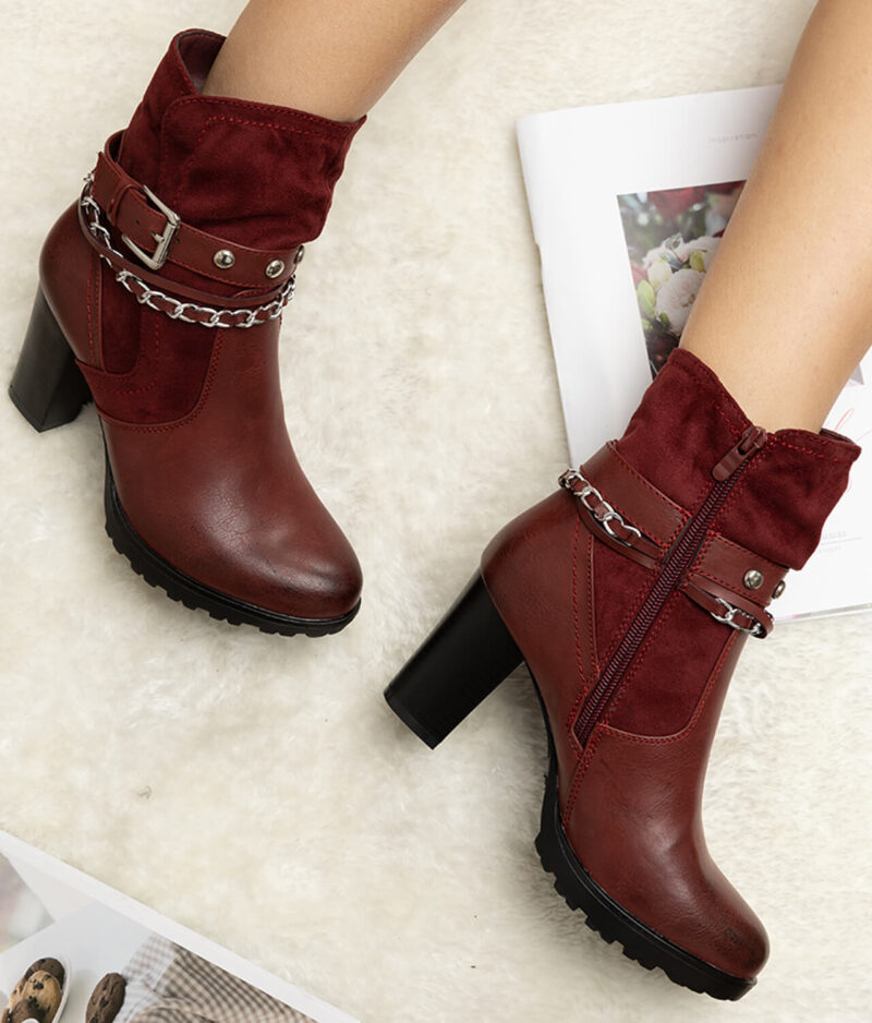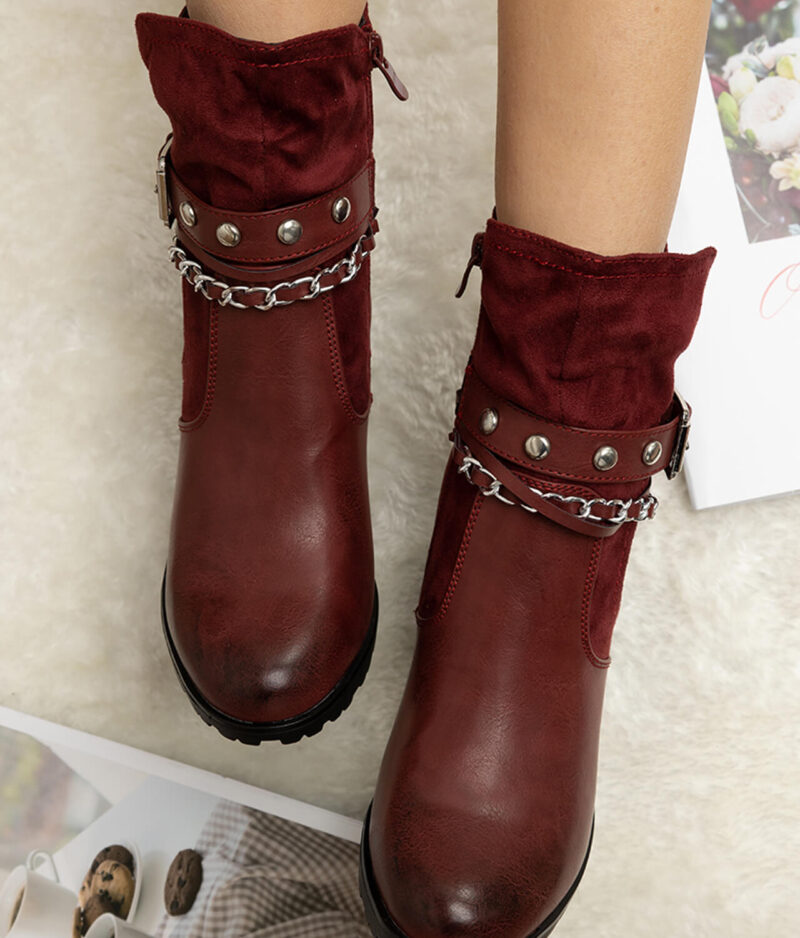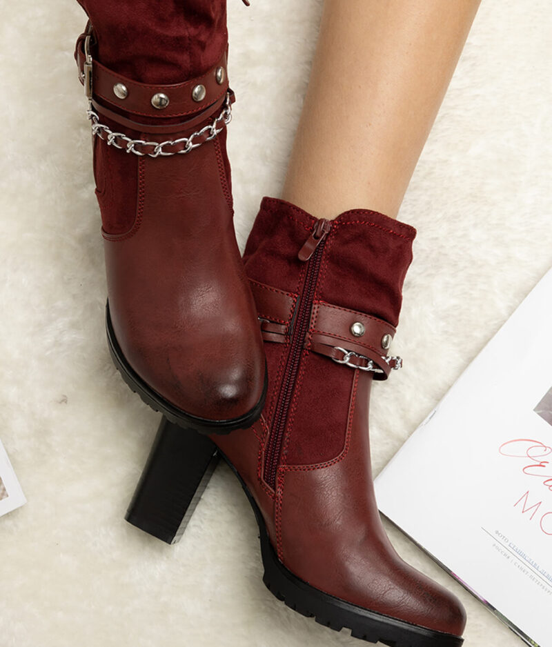 Ženski podloženi škornji s peto v bordo rdeči barvi.